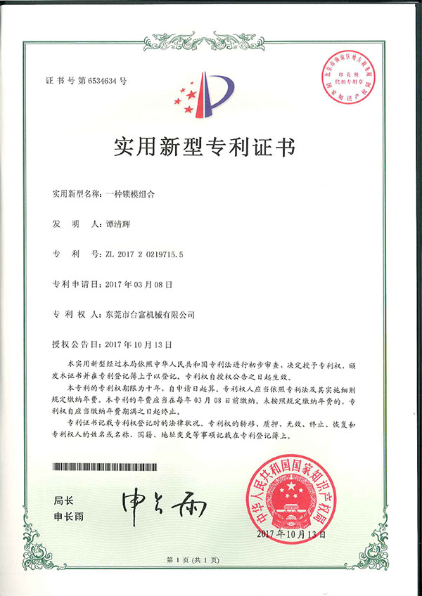 一種鎖模組合專利證書